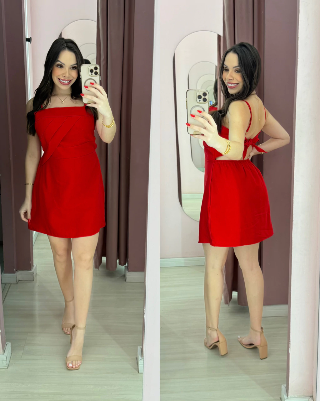 Alça regulável, amarração nas costas e elástico na cintura que modela sem apertar.